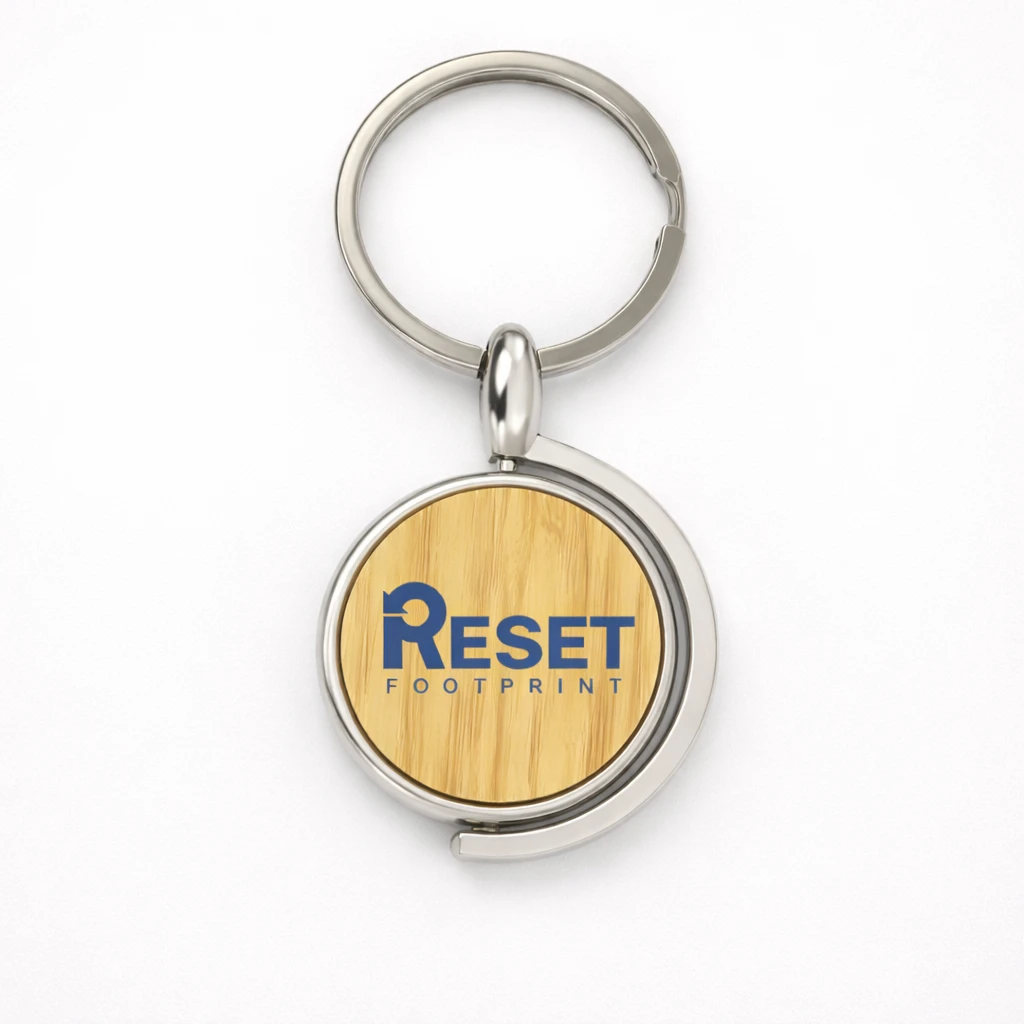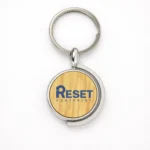 A premium wooden and metal keychain featuring a 360‑degree rotating globe design for global branding and travel themes.